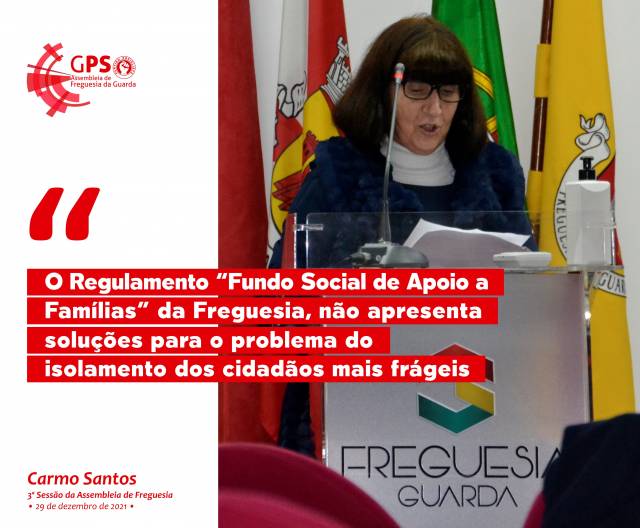 Intervenção realizada na 3ª Sessão da Assembleia de Freguesia da Guarda do mandato autárquico compreendido entre 2021 e 2025, a 29 de dezembro de 2021, no período antes da ordem do dia, nomeadamente no ponto referente aos assuntos de interesse para a Freguesia, para realçar a importância de revisitar o “REGULAMENTO - FUNDO SOCIAL DE APOIO A FAMÍLIAS” em vigor na Freguesia da Guarda, como forma de que o procedimento de acesso ao auxílio aos cidadãos seja simplificado, desburocratizado e divulgado nos meios adequados.