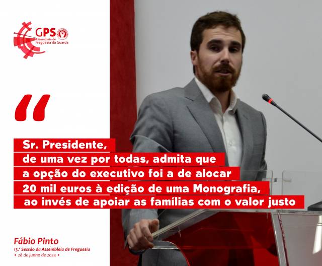 Intervenção realizada na 13.ª Sessão da Assembleia de Freguesia da Guarda do mandato autárquico compreendido entre os anos de 2021 e 2025, a 28 de junho de 2024, no período da ordem do dia, nomeadamente no ponto referente à análise, discussão e votação da Primeira Alteração Modificativa para o ano 2024, para responder à intervenção do Presidente da Junta de Freguesia da Guarda, desafiando o executivo a indicar quais foram constatações do GPS AFG que não correspondem à verdade, no que se refere à análise produzida no âmbito da proposta da primeira alteração modificativa ao Orçamento da Freguesia para o ano de 2024.
