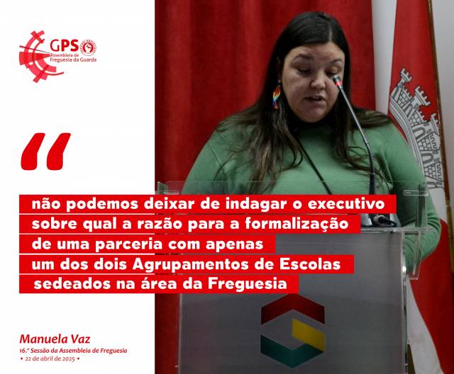 Intervenção realizada na 16.ª Sessão da Assembleia de Freguesia da Guarda do mandato autárquico compreendido entre os anos de 2021 e 2025, a 22 de abril de 2025, no período da ordem do dia, nomeadamente no ponto referente à ratificação do protocolo de colaboração didático-pedagógico com o Agrupamento de Escolas Afonso de Albuquerque, para congratular a iniciativa, considerando que ela está alinhada com as aspirações do GPS AFG no que diz respeito à intervenção da Junta de Freguesia junto da população infantil, focando-se na inteligência emocional como uma forma de prevenção de comportamentos violentos.