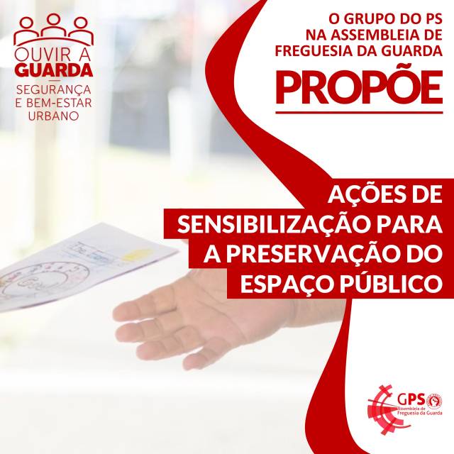 O Grupo do Partido Socialista na Assembleia de Freguesia da Guarda (GPS AFG) apresentou, a 30 de junho de 2023, na 09ª Sessão da Assembleia de Freguesia da Guarda do mandato autárquico compreendido entre 2021 e 2025, uma proposta à Junta de Freguesia da Guarda para que pugne pela articulação, implementação e monitorização entre as várias entidades que atuam no espaço público, no sentido de garantir a promoção de ações de sensibilização para a preservação do espaço público guardense.