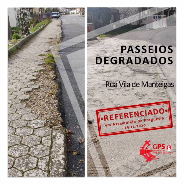 O Grupo do PS na Assembleia de Freguesia da Guarda (GPS AFG) REFERENCIOU a existência de PASSEIOS DEGRADADOS, na RUA VILA DE MANTEIGAS, na 15ª Sessão da Assembleia de Freguesia da Guarda, do mandato compreendido entre 2017-2021, realizada a 29 de dezembro de 2020.